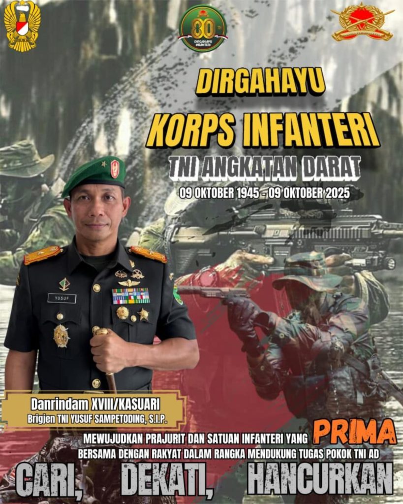 Manokwari Selatan, PB – Komandan Rindam XVIII/Ksr Brigjen TNI Yusuf Sampetoding, S.I.P., memimpin jalannya upacara peringatan Hari Sumpah Pemuda Ke-97 Tahun 2025 yang berlangsung Khidmat
